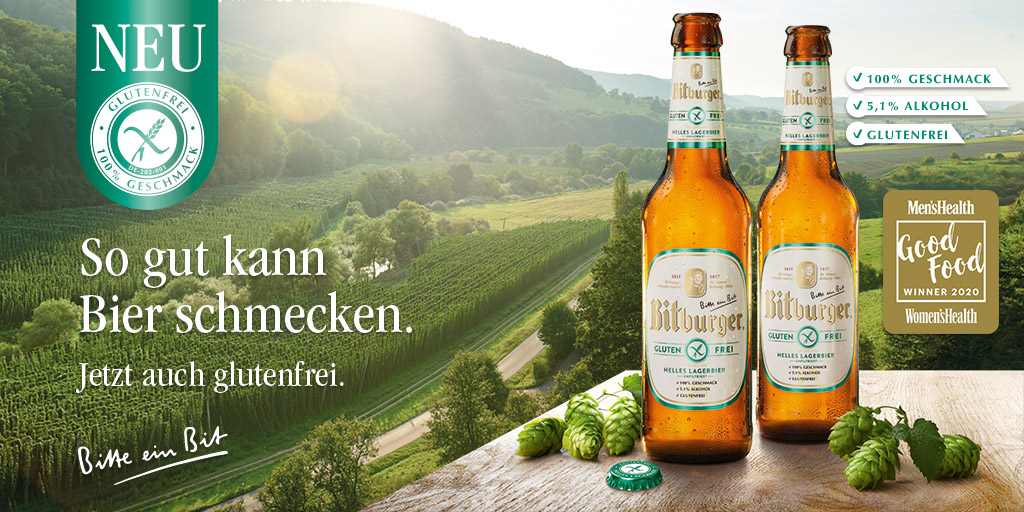 Ein vollmundiges und feinmalzig-hopfiges Bier mit 5,1 % vol Alkohol – aber ganz ohne Gluten. Mit unserem Bitburger Helles Lagerbier – glutenfrei kann auch bei einer Glutenunverträglichkeit unverfälschter Biergeschmack genossen werden. Mit Wasser, Gerstenmalz und Hopfen eingebraut, wird unser glutenfreies Lagerbier mit bestem Bitburger Siegelhopfen verfeinert und reift und lagert mehrere Wochen lang. Durch ein besonderes Verfahren wird dem Bier anschließend das Gluten entzogen. So gut kann Bier schmecken – jetzt auch glutenfrei.